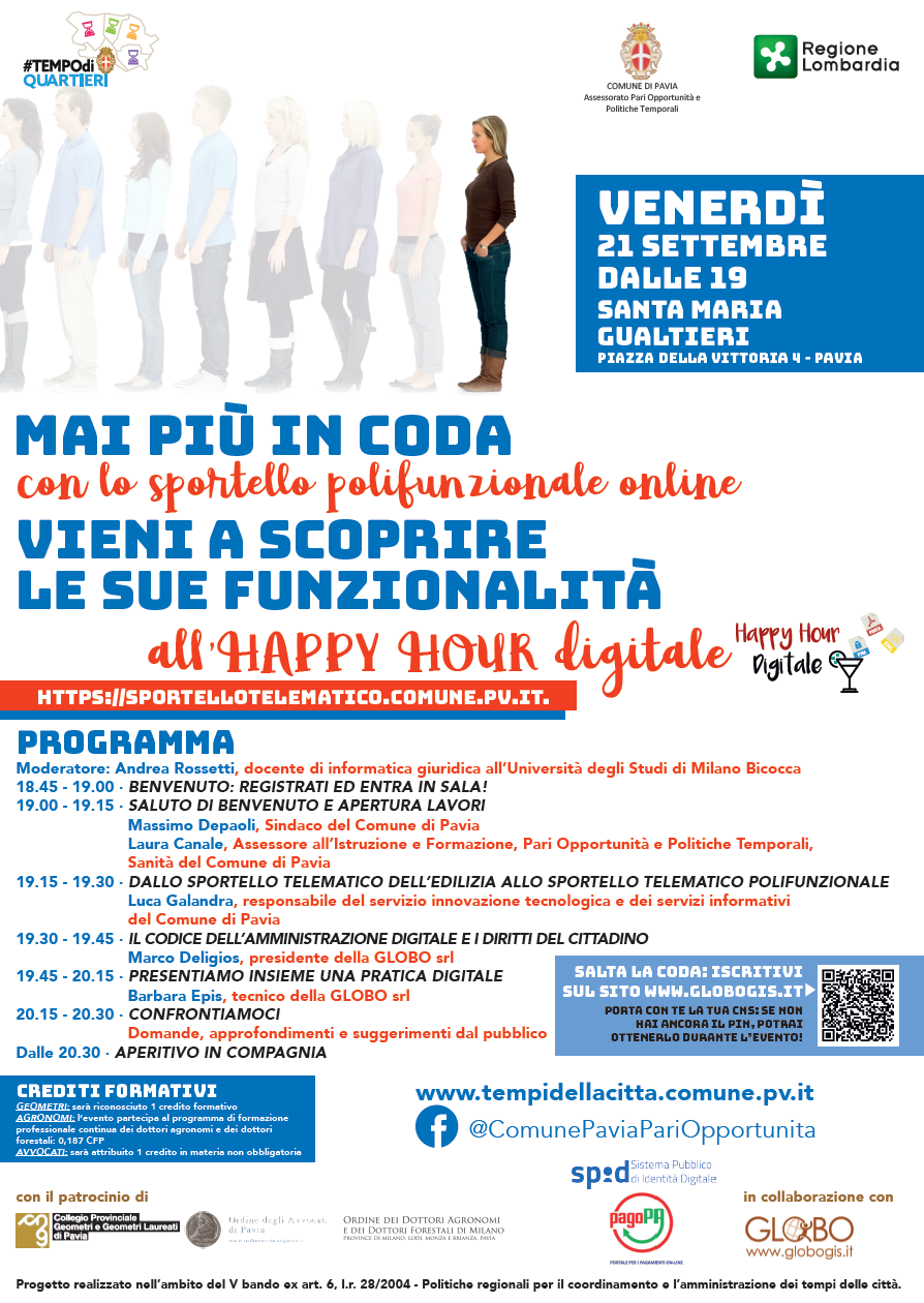 L’appuntamento per l’happy hour digitale è fissato per la serata di venerdì 21 settembre 2018, alle 19.00, presso la sala di Santa Maria Gualtieri, piazza della Vittoria 4, Pavia.