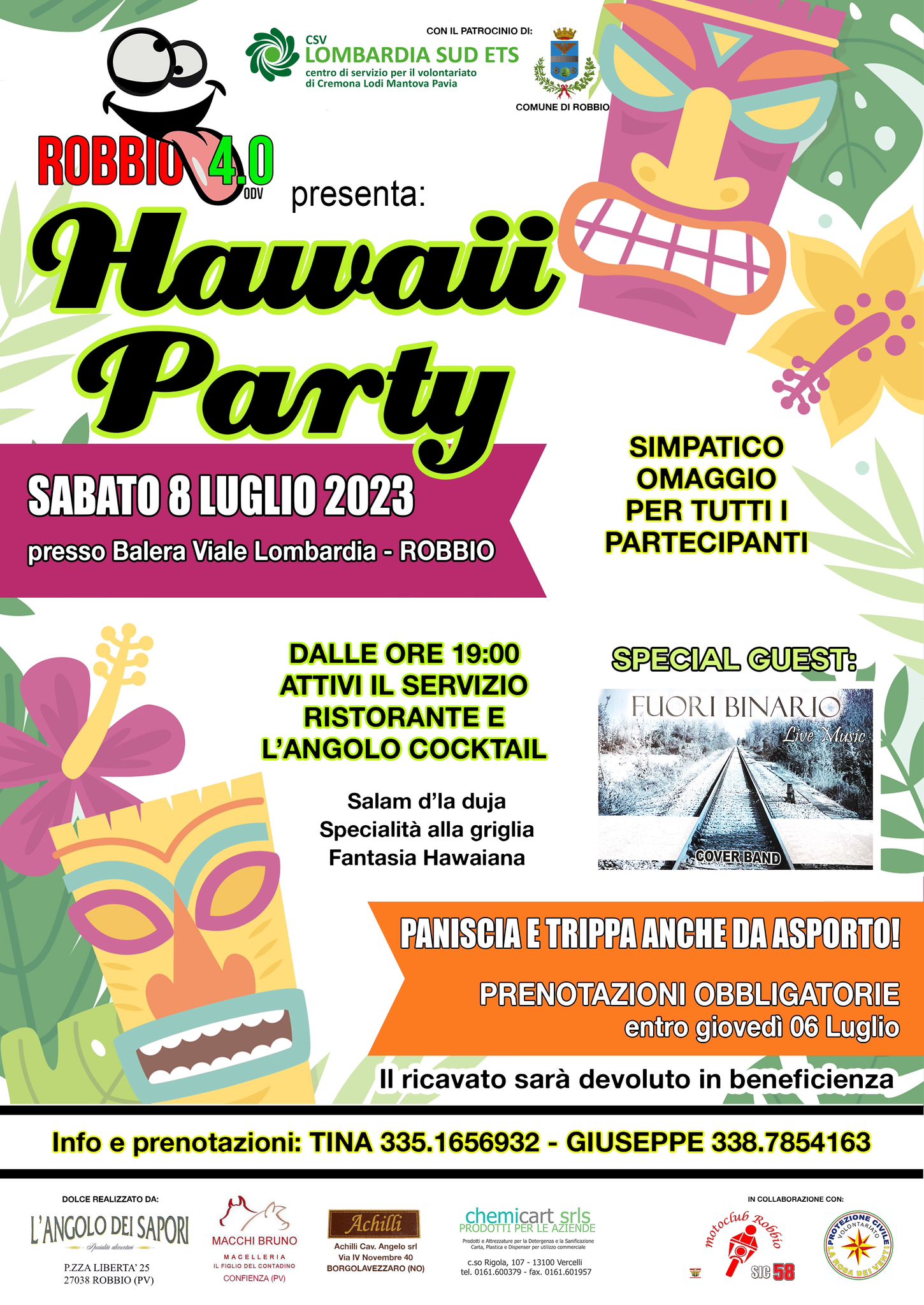 Il giorno sabato 8 luglio con inizio alle 19 a Robbio, presso la balera in Viale Lombardia, si svolgera’ l’evento “HAWAII PARTY”, evento nel quale gli obiettivi saranno promuovere il volontariato e recuperare risorse da dare in beneficenza.