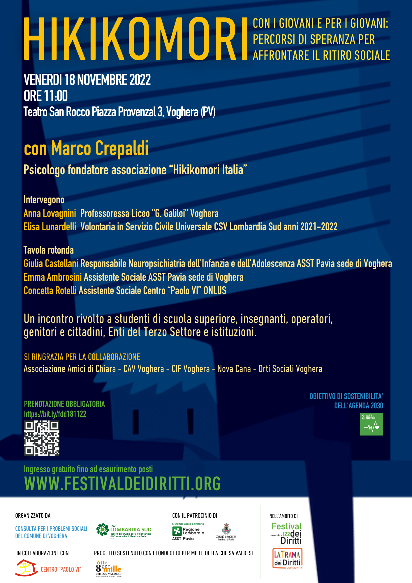 La mattina di venerdì 18 novembre alle 11 presso il Teatro San Rocco di piazza Provenzal a Voghera si terrà il convegno: HIKIKOMORI. CON I GIOVANI E PER I GIOVANI: PERCORSI DI SPERANZA PER AFFRONTARE IL RITIRO SOCIALE.
