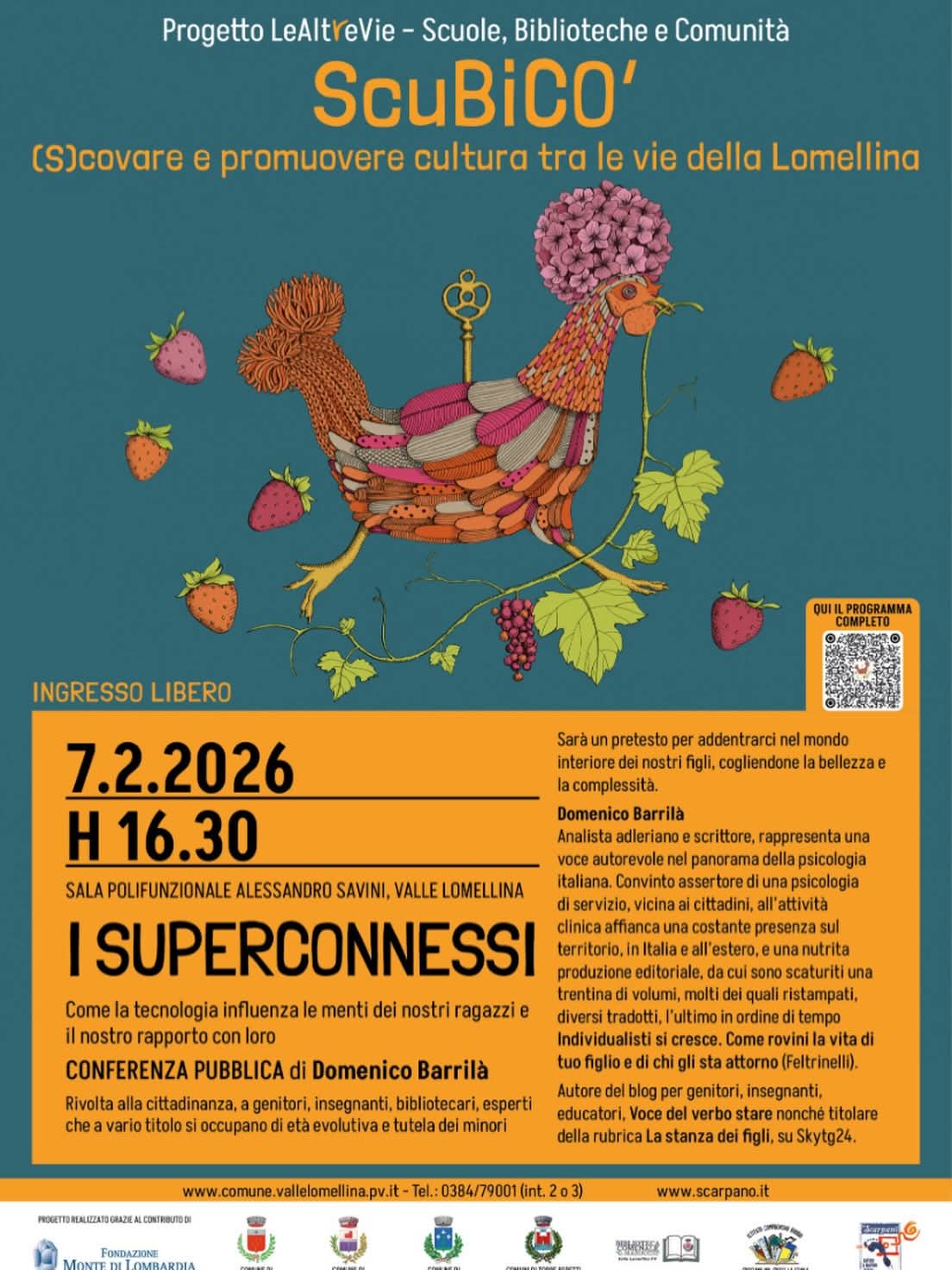 Sabato 7 febbraio 2026, alle ore 16.30, presso la Sala Polifunzionale Alessandro Savini di Valle Lomellina, si terrà la conferenza pubblica “I Superconnessi”, a cura di Domenico Barrilà.