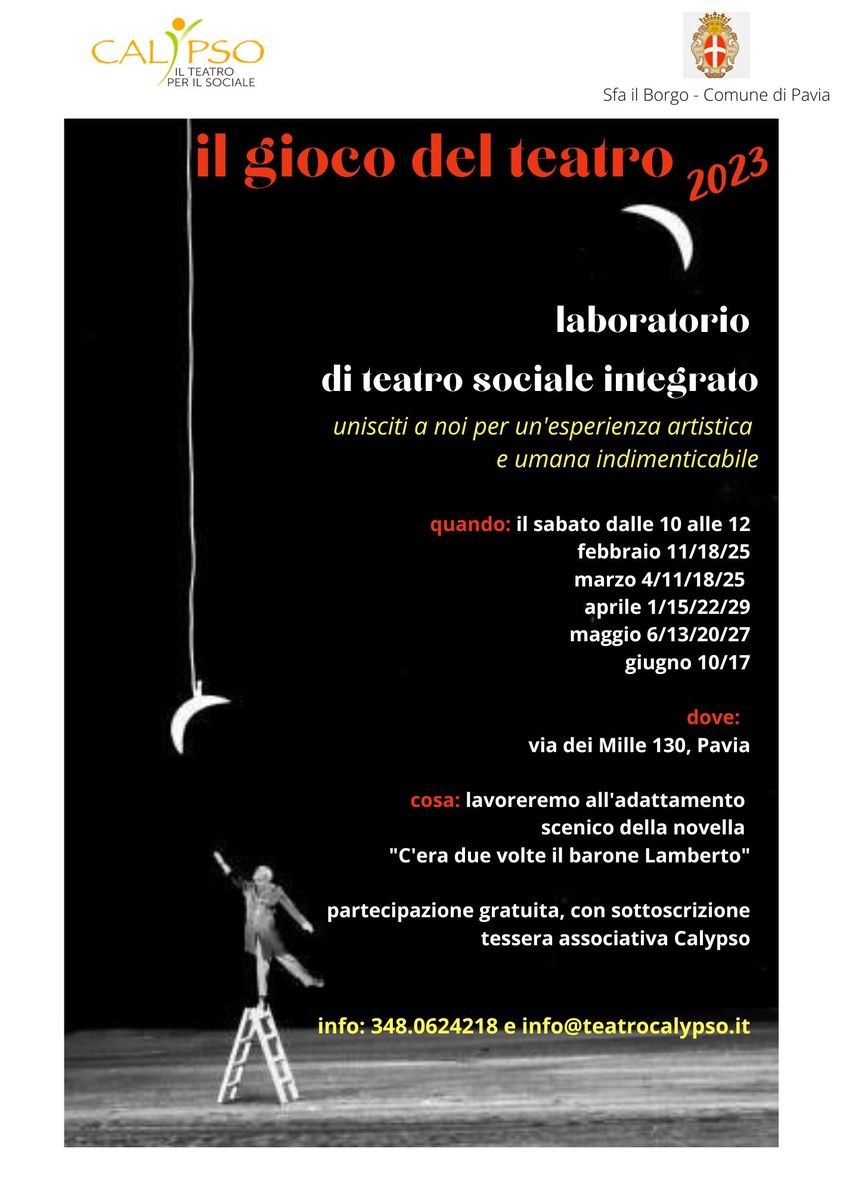 Da partire da febbraio, fino ad arrivare a giugno, alcuni sabati del mese dalle 10 alle 12, si lavorerà all’adattamento scenico della novella “C’era due volte il barone Lamberto”, presso via dei Mille 130, Pavia. La partecipazione è gratuita con sottoscrizione alla tessera associativa di Calypso.