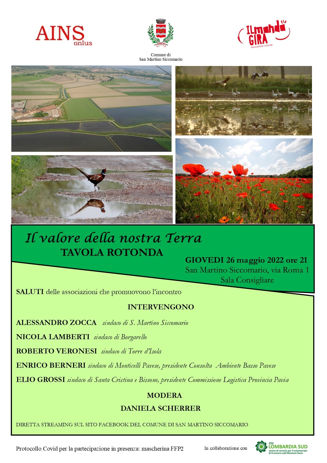 Giovedì 26 maggio 2022, alle ore 21:00, si terrà presso la Sala Consigliare di San Martino Siccomario (via Roma 1), la tavola rotonda “Il valore della nostra Terra”, organizzata da AINS onlus e Il Mondo Gira.