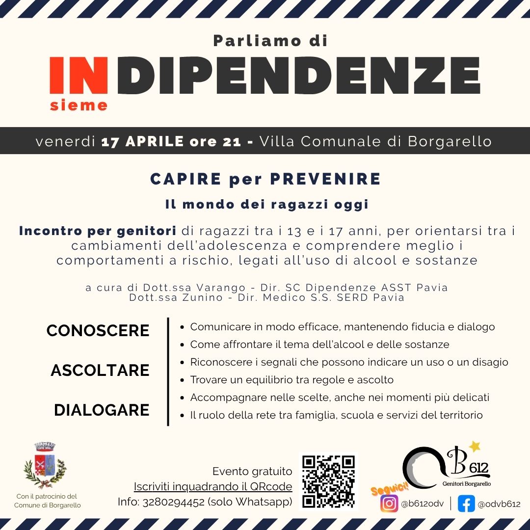 Marco Piras2026-04-14T11:24:27+02:00Venerdì 17 aprile 2026 alle ore 21.00, presso la Villa Comunale di Borgarello, si terrà l’incontro “In Dipendenze – capire e prevenire”, un appuntamento rivolto a genitori e ragazzi tra i 13 e i 17 anni.