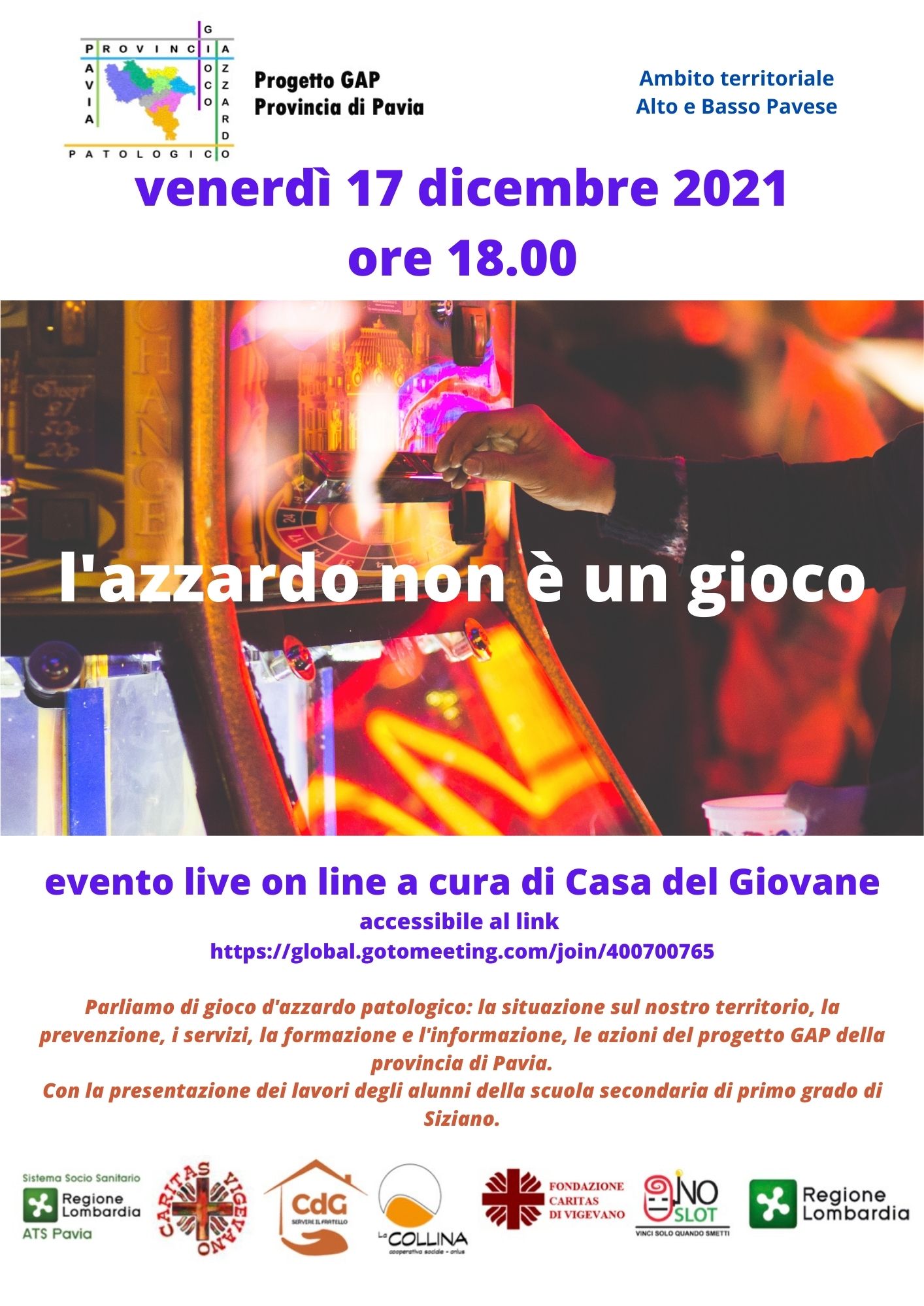 Venerdì 17 dicembre 2021, alle ore 18:00, si terrà l’evento online “L’azzardo non è un gioco” a cura di Casa del Giovane.
