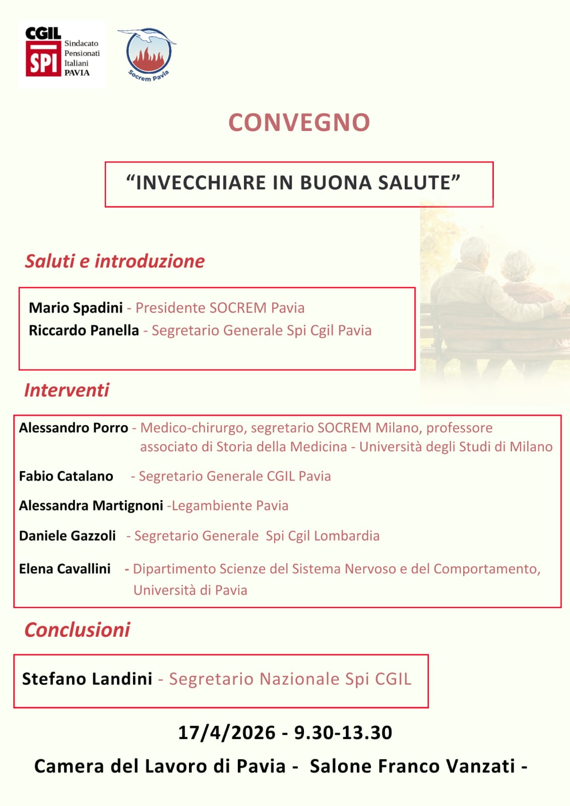 Marco Piras2026-04-14T12:13:29+02:00Giovedì 17 aprile 2026, dalle ore 9.30 alle 13.30, presso la Camera del Lavoro di Pavia (Salone Franco Vanzati), si terrà il convegno “Invecchiare in buona salute”, promosso da SPI CGIL Pavia e SOCREM Pavia.