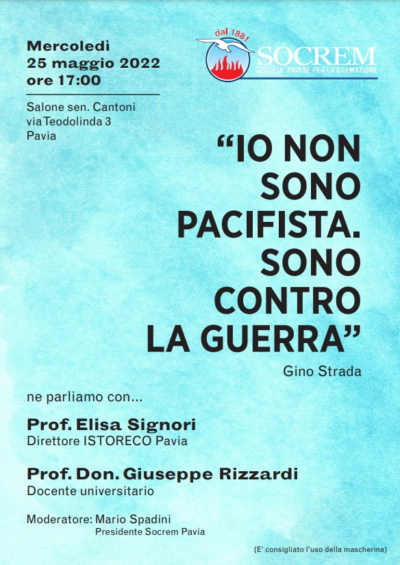 Mercoledì 25 maggio 2022, alle ore 17:00, si terrà un incontro organizzato da SOCREM Pavia sul tema della guerra e le riflessioni di Gino Strada a proposito di essa.