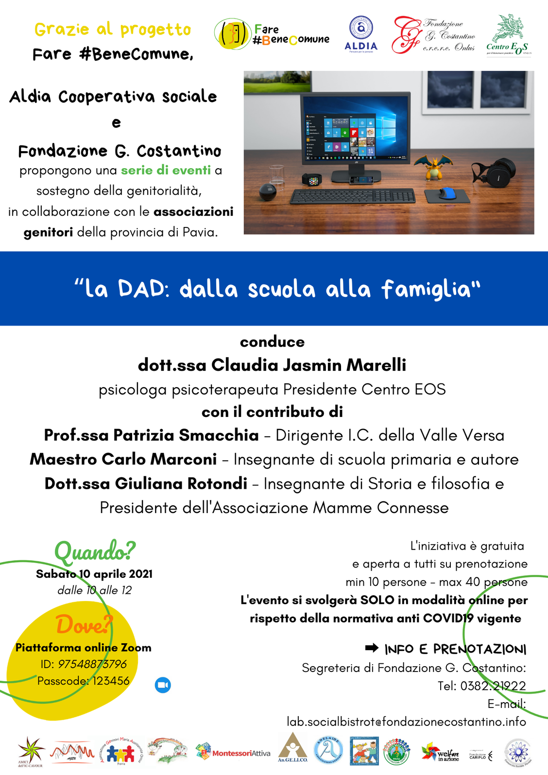L’evento è organizzato da Fondazione G. Costantino e Aldia Cooperativa Sociale e sarà condotto dalla dott.ssa Claudia Jasmin Marelli psicologa psicoterapeuta Presidente Centro EOS per il Benessere Psichico che dialogherà con la prof.ssa Patrizia Smacchia – Dirigente I.C. della Valle Versa, il maestro Carlo Marconi – insegnante di scuola primaria e autore e la dott.ssa Giuliana Rotondi – insegnante di Storia e filosofia e Presidente dell’Associazione Mamme Connesse.