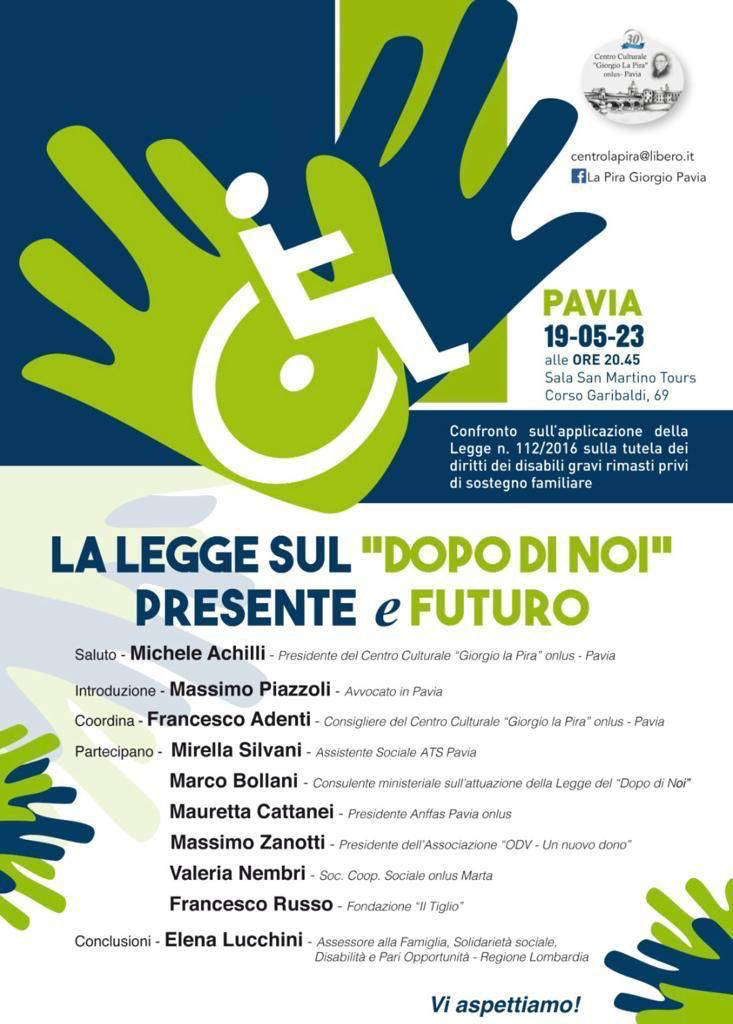 Il 19 maggio alle 20,45 presso la Sala San Martino di Tours in Corso Garibaldi 69 a Pavia, si svolge l’incontro “La legge sul dopo di noi. presente e futuro” promosso dal Centro culturale “Giorgio La Pira” onlus.