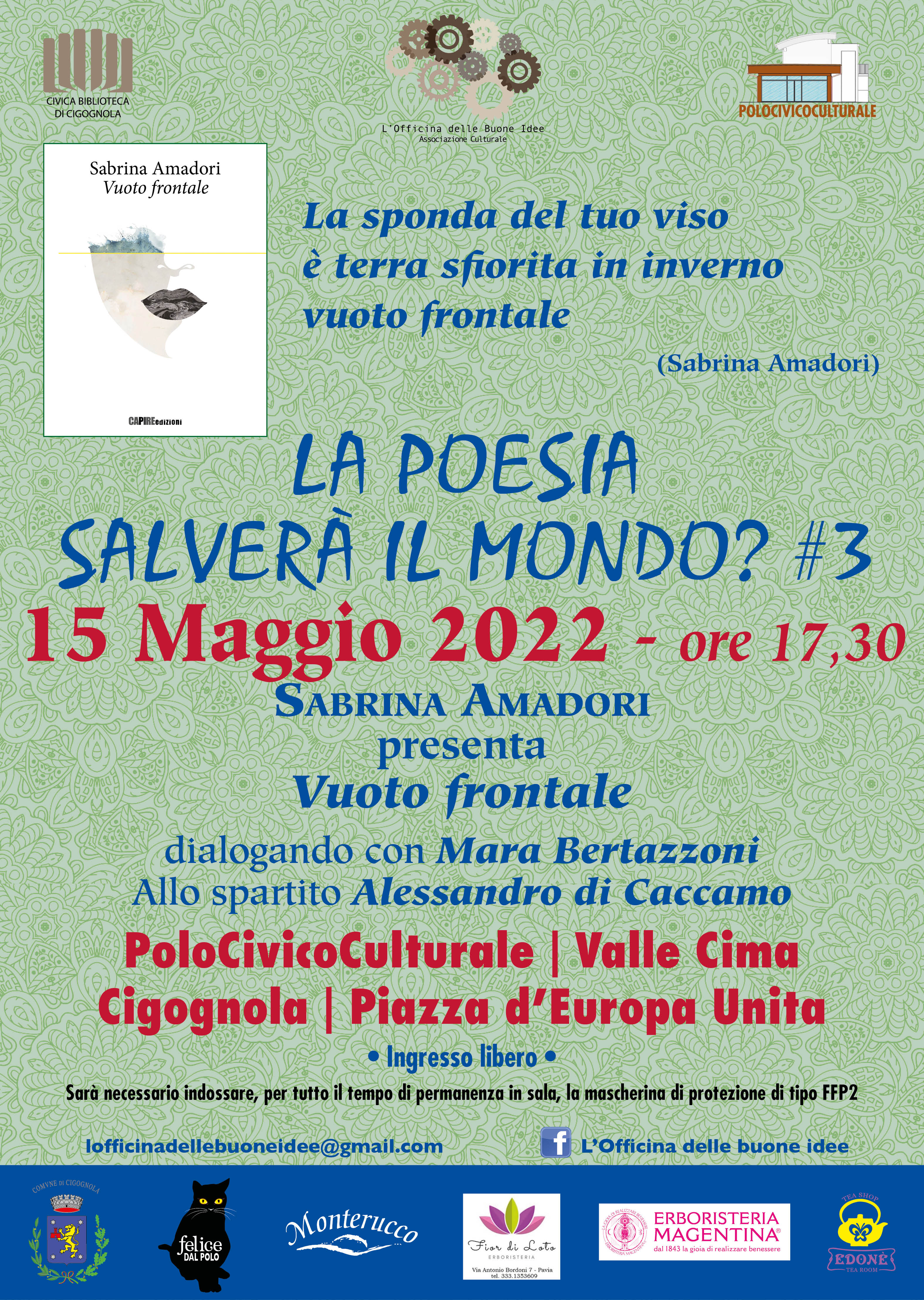 Domenica 15 maggio, alle ore 17:30, si terrà presso il PoloCivicoCulturale di Valle Cima (Piazza d’Europa Unita, Cicognola) il terzo appuntamento della rassegna “La poesia salverà il mondo?” organizzata dall’Associazione culturale L’Officina delle Buone Idee.