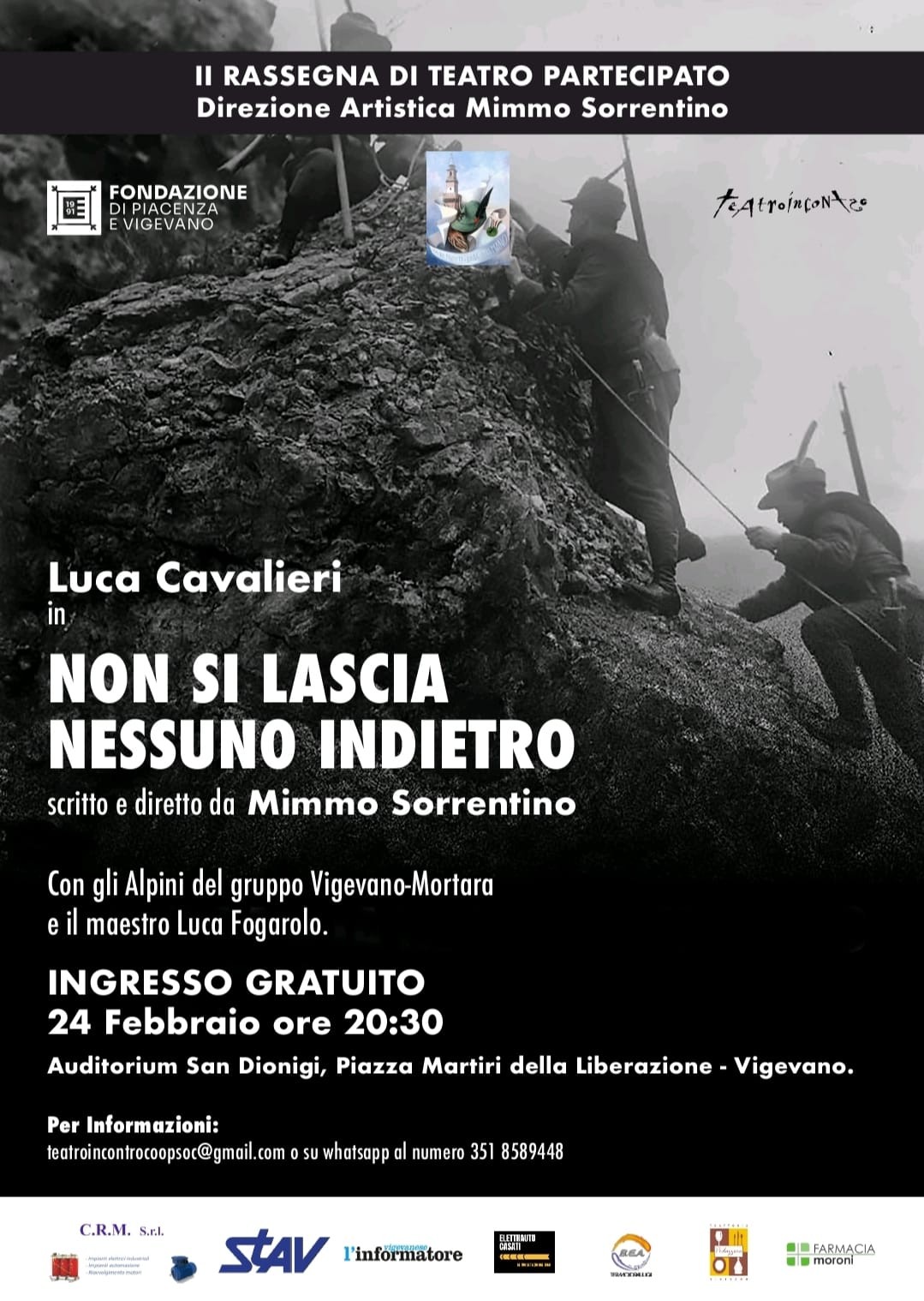 In scena all’Auditorium San Dionigi in piazza Martiri della Liberazione a Vigevano il 24 febbraio alle ore 20,30 lo spettacolo gratuito Non si lascia nessuno indietro. Un lungo viaggio nella storia del Corpo degli Alpini, dalla nascita (1872), sino ai giorni nostri.
