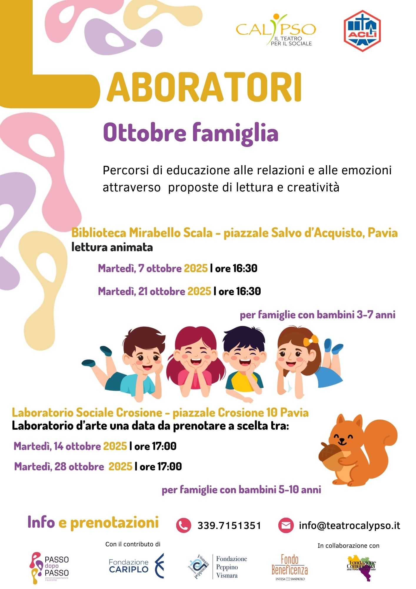 Il mese di ottobre porta a Pavia una nuova proposta di laboratori dedicati alle famiglie, con percorsi di educazione alle relazioni e alle emozioni attraverso letture animate e attività creative. L’iniziativa è promossa da Calypso – Il teatro per il sociale e ACLI, con il sostegno di Passo dopo Passo, Fondazione Cariplo, Fondazione Peppino Vismara, Fondo di Beneficenza Intesa Sanpaolo e con la collaborazione della Fondazione Comunitaria della Provincia di Pavia.