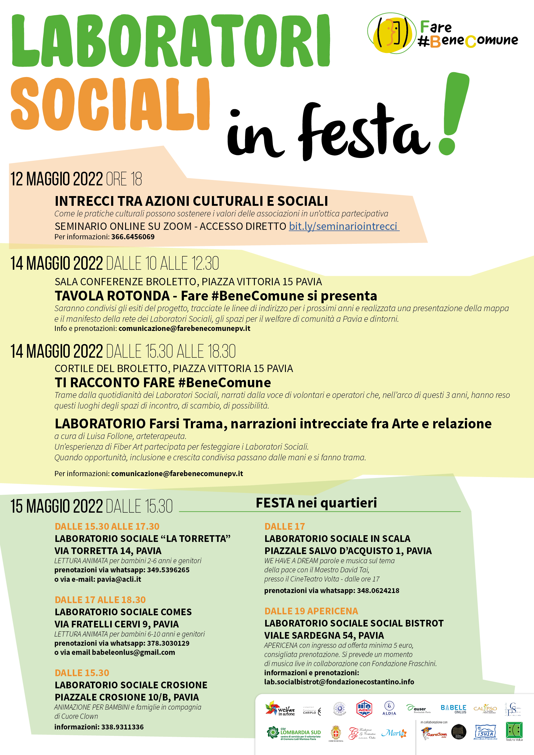 Domenica 15 maggio 2022 pomeriggio, la festa prosegue nei quartieri: i vari Laboratori Sociali diffusi in città propongono diverse iniziative: letture animate per bambini, animazione di clownerie, concerto e apericena.
