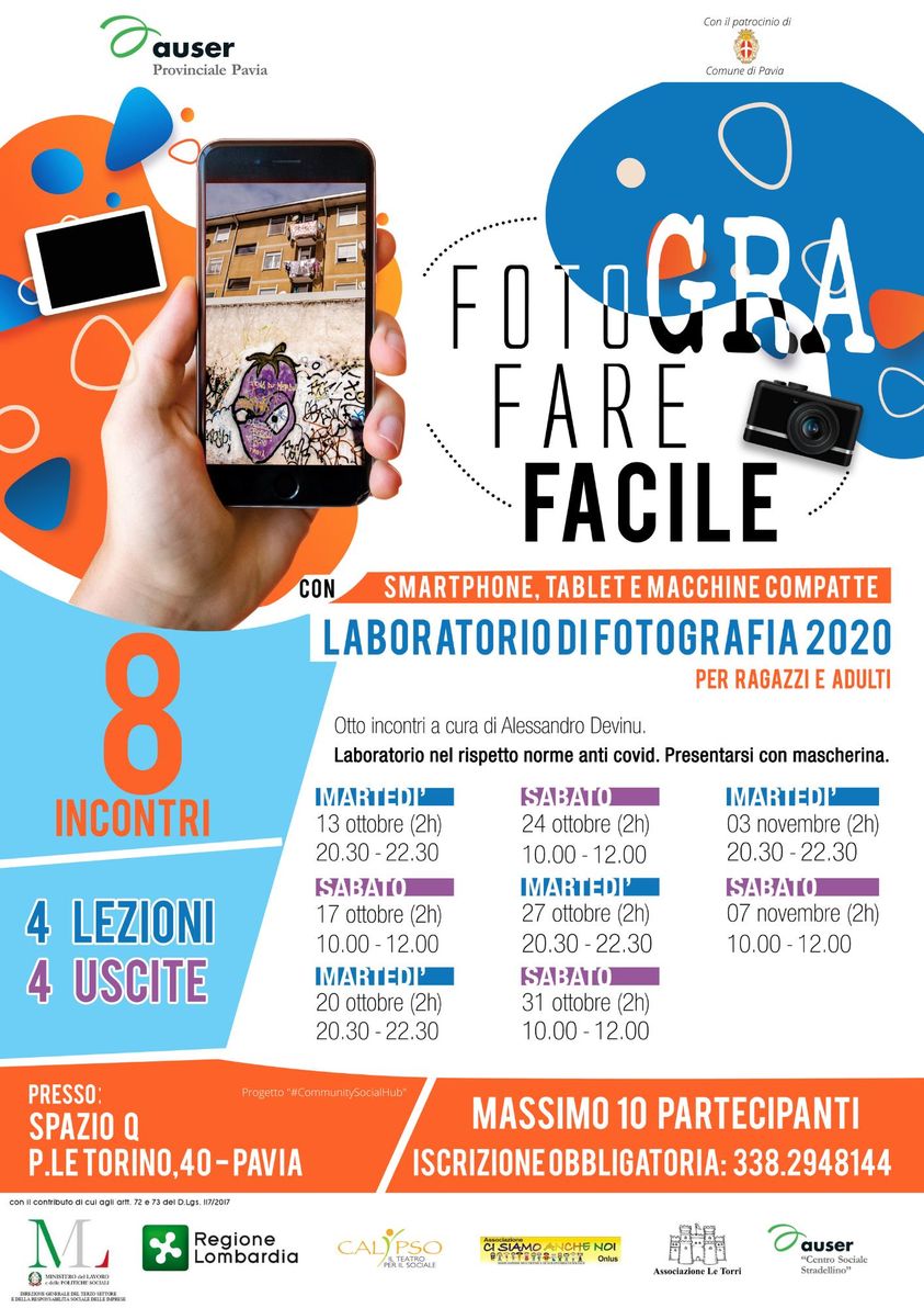 Presso lo Spazio Q in piazzale Torino a Pavia, da martedi 13 ottobre inizia un laboratorio di fotografia per smartphone, tablet e machine compatte.