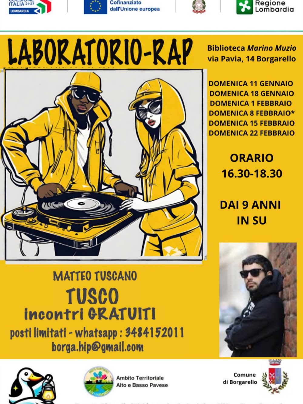 A Borgarello parte il Laboratorio Rap con Tusco (Matteo Tuscano), un percorso creativo pensato per giovani che vogliono esprimersi attraverso parole, ritmo e suono.