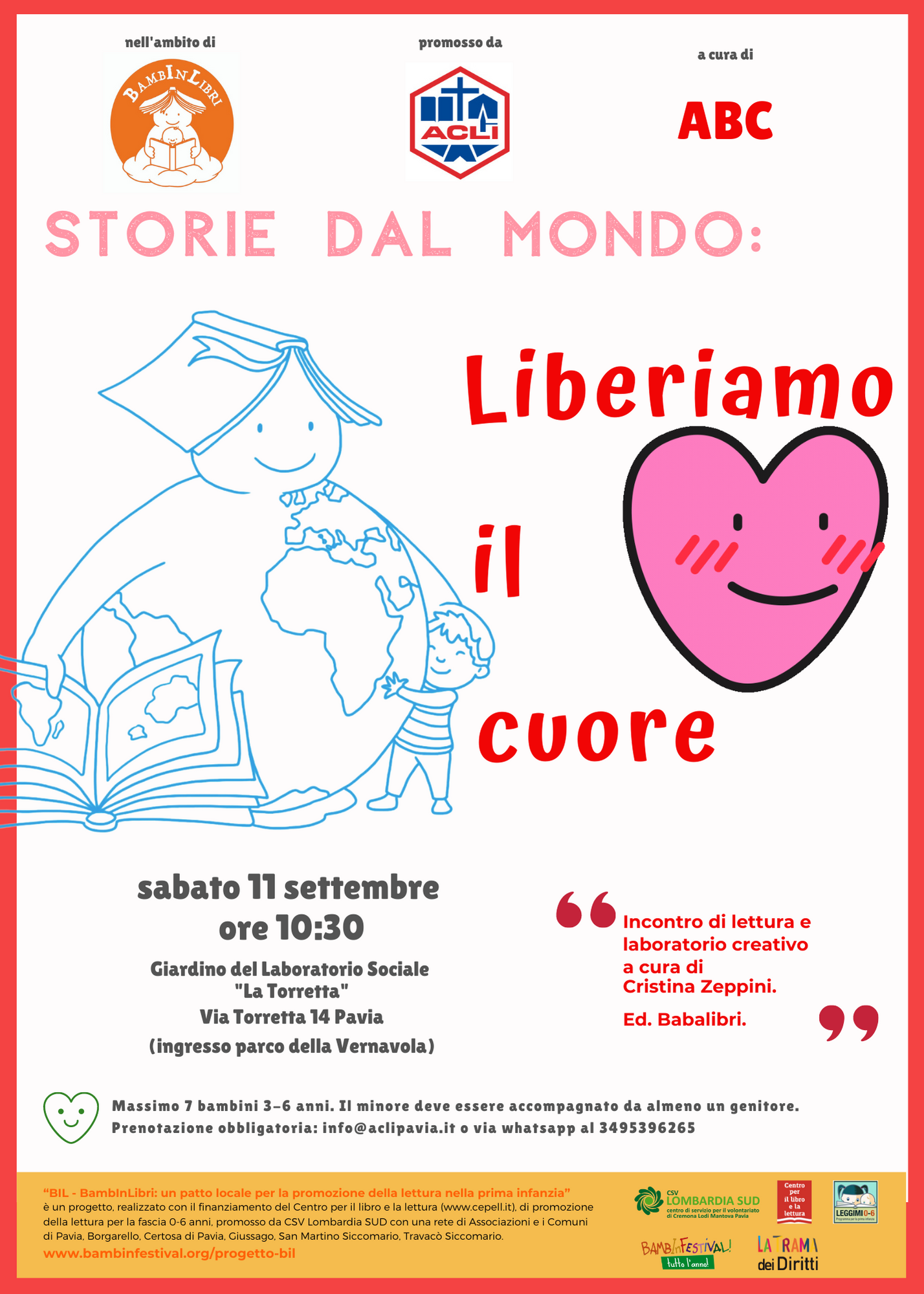 Tornano gli appuntamenti con BiL del sabato mattina, questa volta al Laboratorio Sociale La Torretta Cristina Zeppini di ABC propone “Liberiamo il cuore” sabato 11 settembre alle 10:30 una storia e un laboratorio creativo.