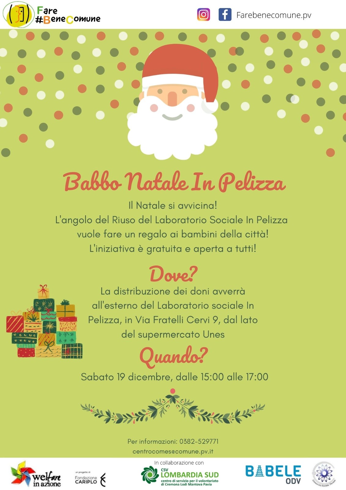 La distribuzione dei doni si svolgerà sabato 19 dicembre all’esterno del Laboratorio Sociale In Pelizza, via Fratelli Cervi 9 (lato supermercato Unes). L’iniziativa è gratuita ed aperta a tutti.