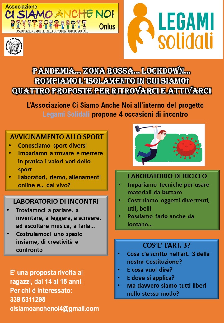 Inizieremo con le attività in modalità remota per ritrovarci da VICINO appena possibile, l’importante è tracciare insieme un percorso di LEGAMI SOLIDALI, iniziando da lontano e sperando di lavorare poi all’aperto, in sicurezza, magari con una merenda o spuntino o una mostra di quello che abbiamo costruito insieme.