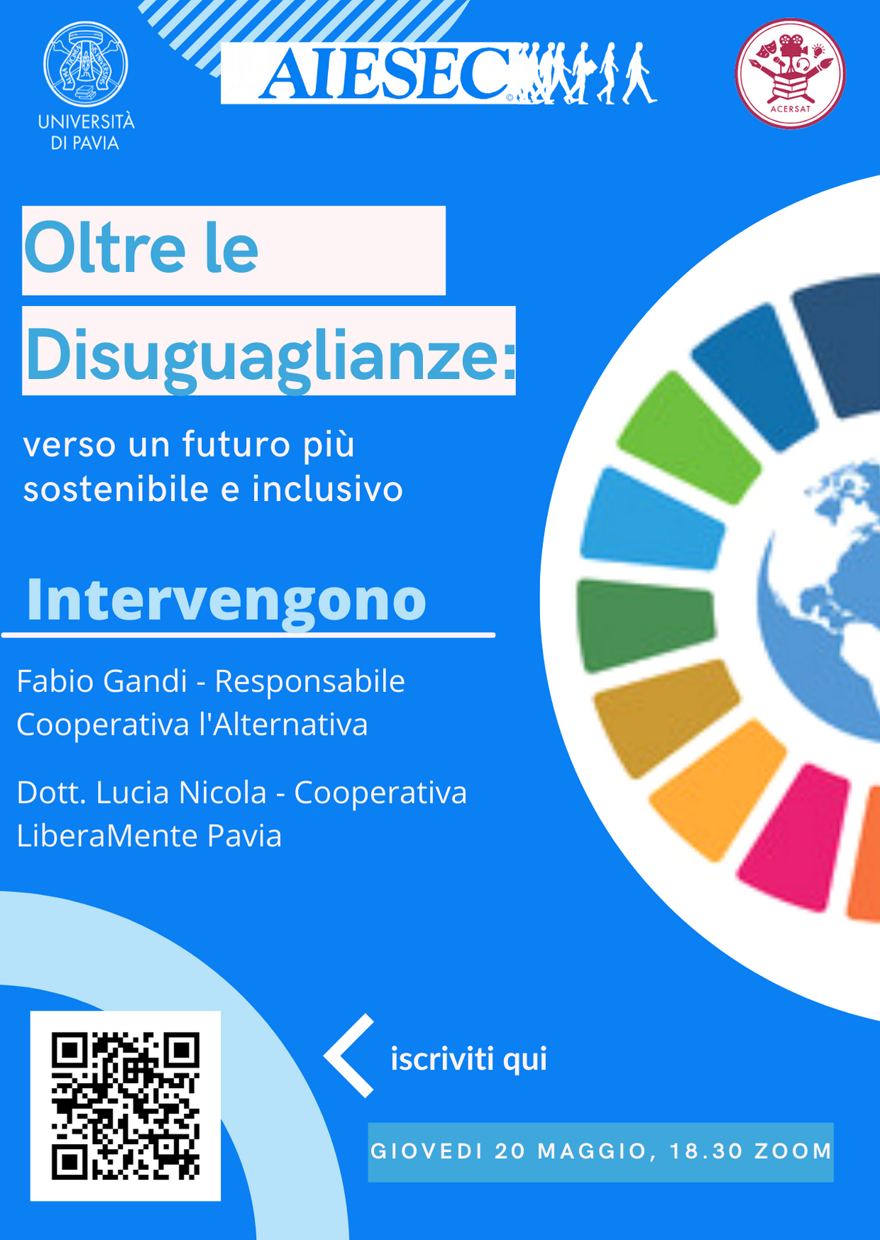 AIESEC con A.C.E.R.S.A.T e Università di Pavia, propone per giovedì 20 maggio alle ore 18.30 sulla piattaforma Zoom, l’evento, dal titolo Oltre le Disuguaglianze: verso un futuro più sostenibile e inclusivo.