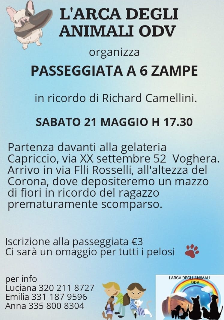 Sabato 21 maggio 2022, alle ore 17:30, si terrà a Voghera una passeggiata in ricordo di Richard Camellini, ragazzo che è mancato investito ad ottobre, organizzata da L’Arca degli Animali ODV.