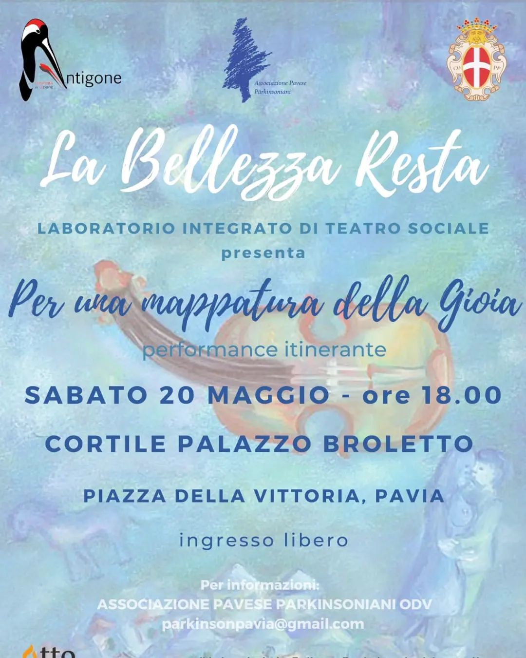 Sabato 20 maggio alle ore 18 nel Cortile del Palazzo Broletto in piazza della Vittoria a Pavia si svolge: “Per una mappatura della gioia”, ispirato ad “Alfabeti della Gioia” di Gianluigi Gherzi, è l’esito finale del laboratorio integrato di Teatro Sociale “La Bellezza Resta”, che accoglie malati di Parkinson e cittadinanza sensibile. La performance è a ingresso gratuito.