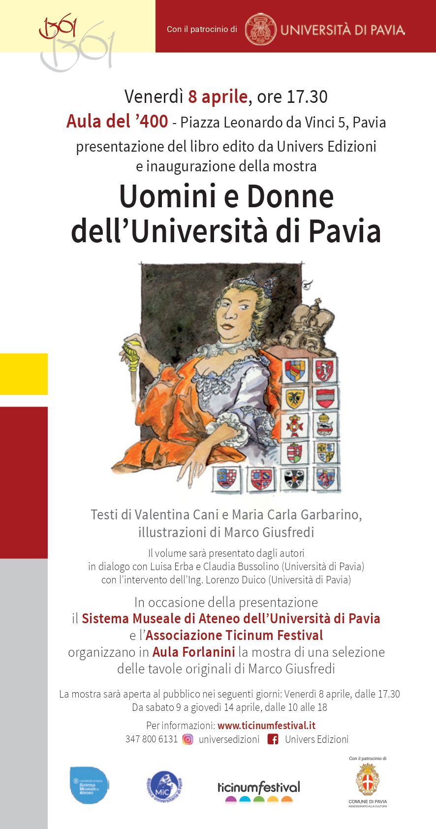 Venerdì 8 aprile 2022, alle ore 17:30, presso l’Aula del ‘400 dell’Università di Pavia (Piazza Leonardo da Vinci 5, Pavia), verrà presentato il libro “Uomini e Donne dell’Università di Pavia” di Valentina Cani e Maria Carla Garbarino, illustrato da Marco Giusfredi, edito da Univers Edizioni. Si terrà in questa occasione anche l‘inaugurazione della mostra delle tavole illustrate del volume.