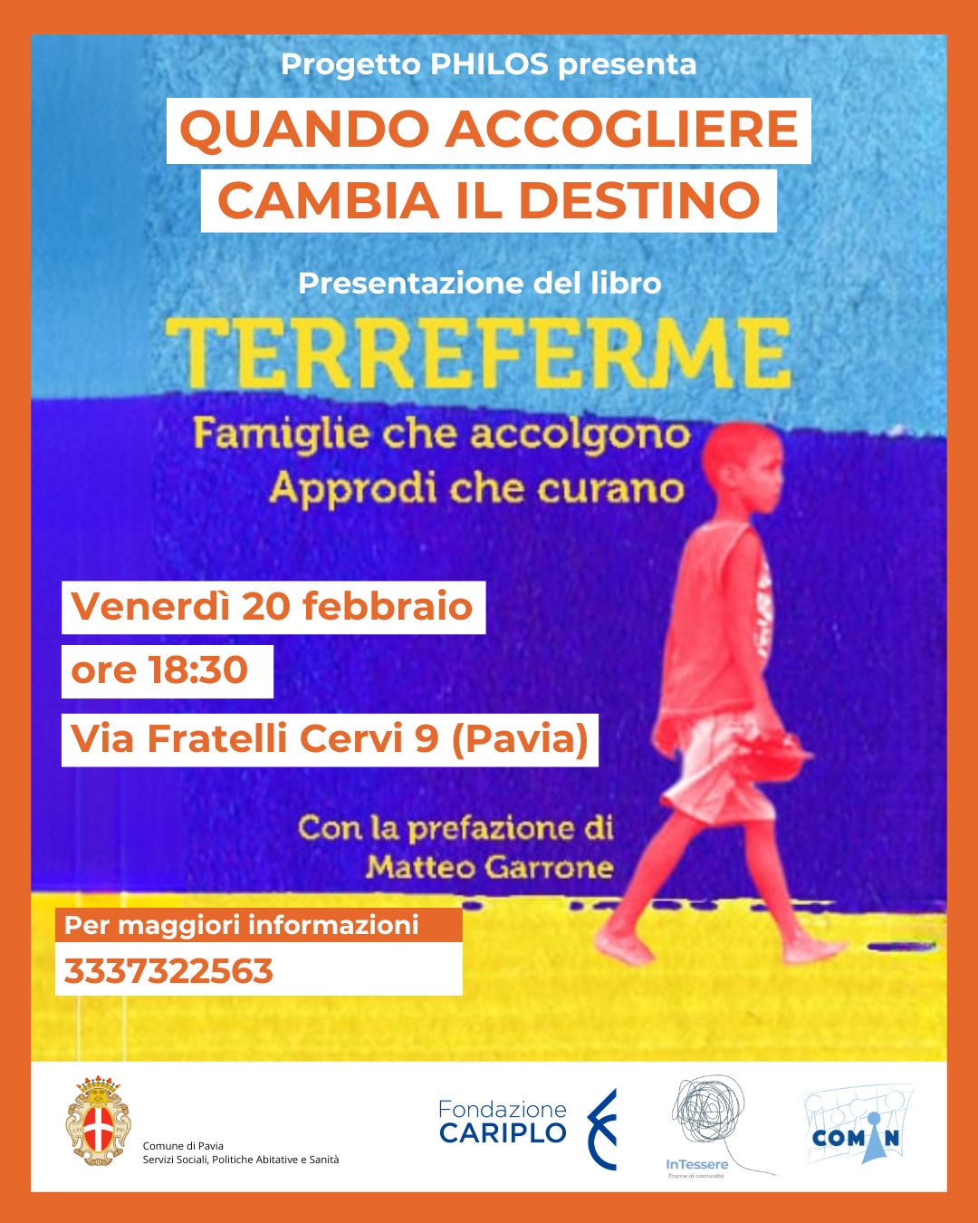 Venerdì 20 febbraio alle ore 18.30, presso il Centro Comes in via Fratelli Cervi 9 a Pavia, si terrà un incontro dedicato alla presentazione del libro “TERREFERME: famiglie che accolgono, approdi che curano”.