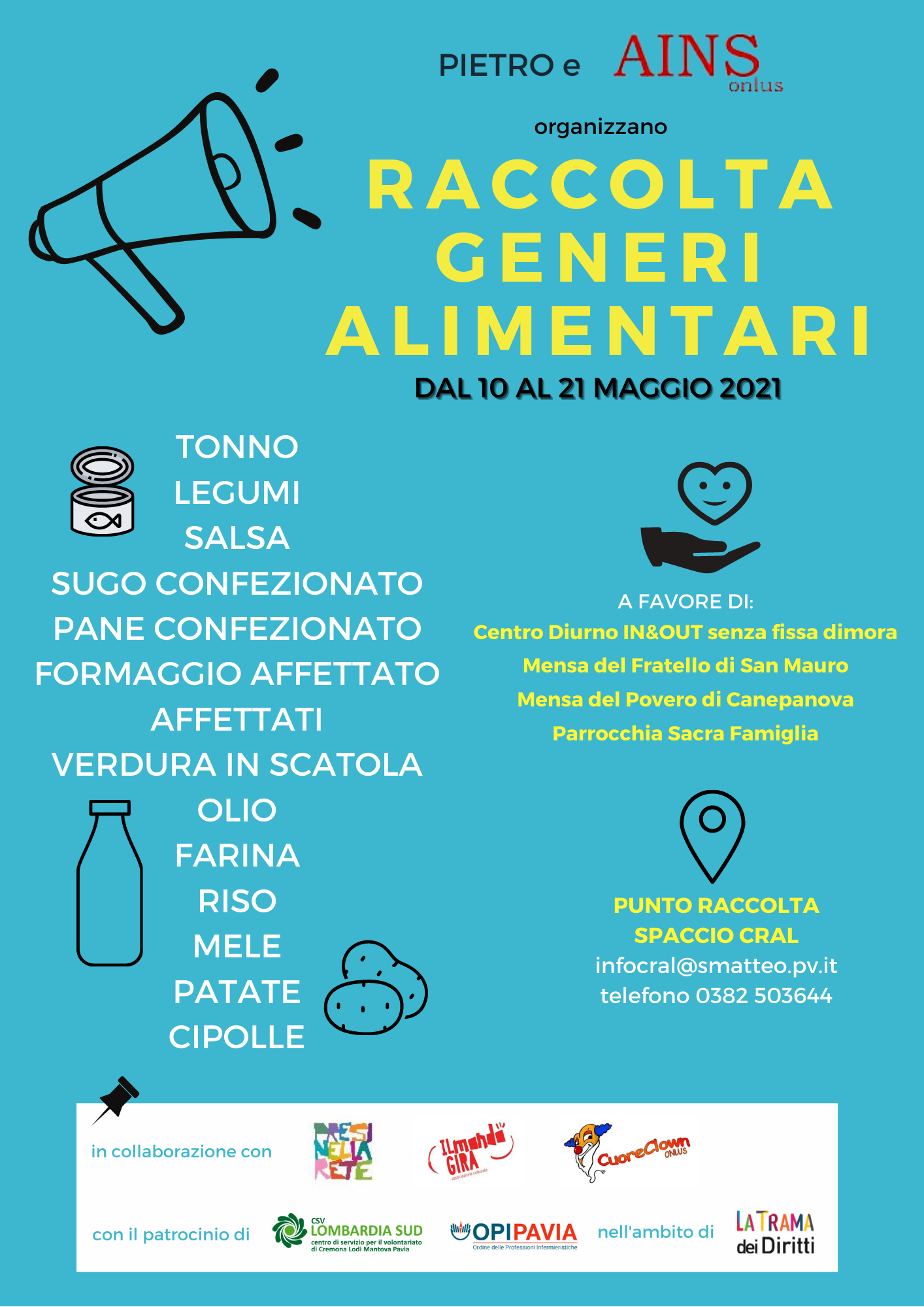 Dal 10 al 21 maggio, l’Associazione AINS, in collaborazione con Presi nella rete, Il mondo gira, Cuore clown promuove all’interno del CRAL del San Matteo di Pavia un raccolta di generi alimentari a favore delle seguenti realtà: