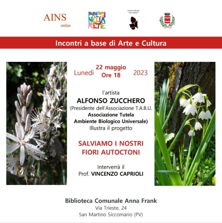 L’associazione AINS, in collaborazione con Presi nella Rete e Comune di San Martino Siccomario organizza un incontro in cui l’artista Alfonso Zucchero (oltre che Presidente dell’associazione T.A.B.U. – Associazione Tutela Ambiente Universale) presenta il progetto “Salviamo i nostri fiori autoctoni”.