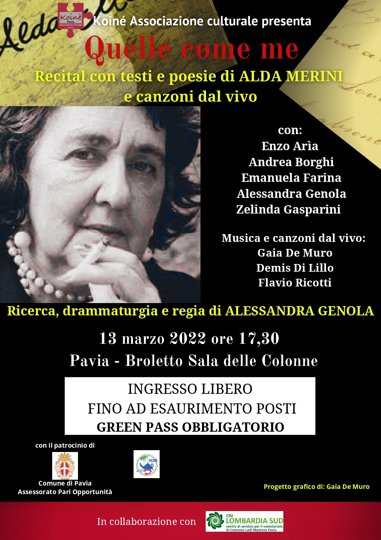 Domenica 13 marzo 2022, alle ore 17:30, presso Palazzo Broletto, Sala delle Colonne, a Pavia, si terrà l’incontro “Quelle come me“, un recital con testi e poesie di Alda Merini, con canzoni dal vivo, organizzato da Koiné associazione culturale.