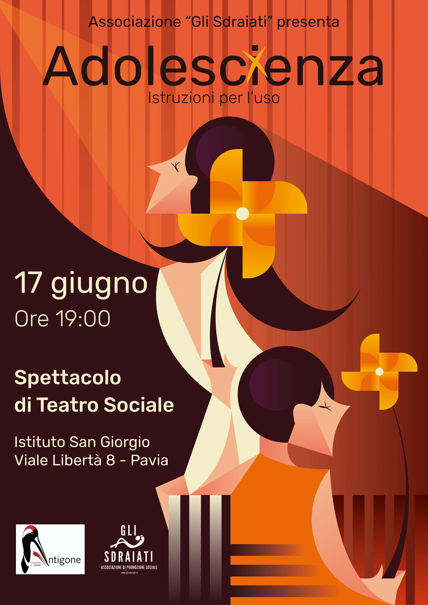 Venerdì 17 giugno, alle ore 19:00, si terrà presso l’Istituto San Giorgio di Pavia (Viale Libertà 8) lo spettacolo teatrale “Adolescienza: istruzioni per l’uso”, realizzato dall’associazione Gli Sdraiati con Antigone Pavia APS.