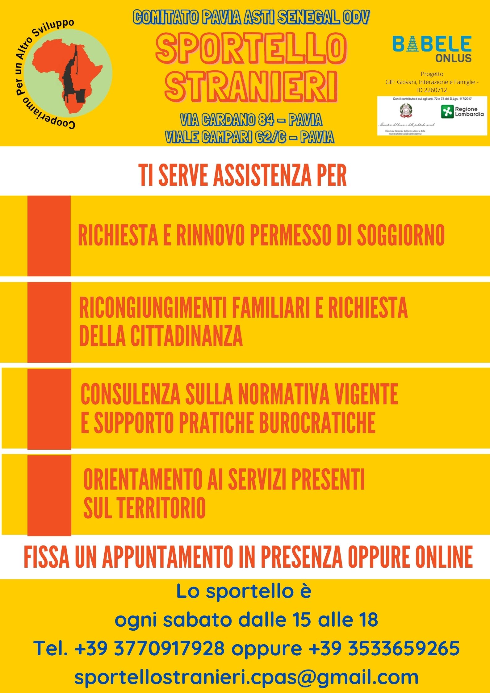Nell’ambito del progetto GIF (GIOVANI INTERAZIONE FAMIGLIE) finanziato da Regione Lombardia e Ministero del Lavoro e delle Politiche Sociali, l’associazione CPAS – Comitato Pavia Asti Senegal ODV prosegue l’attività dello sportello stranieri aperto un giorno a settimana per sostenere giovani e famiglie che in questo periodo stanno attraversando un momento di difficoltà.