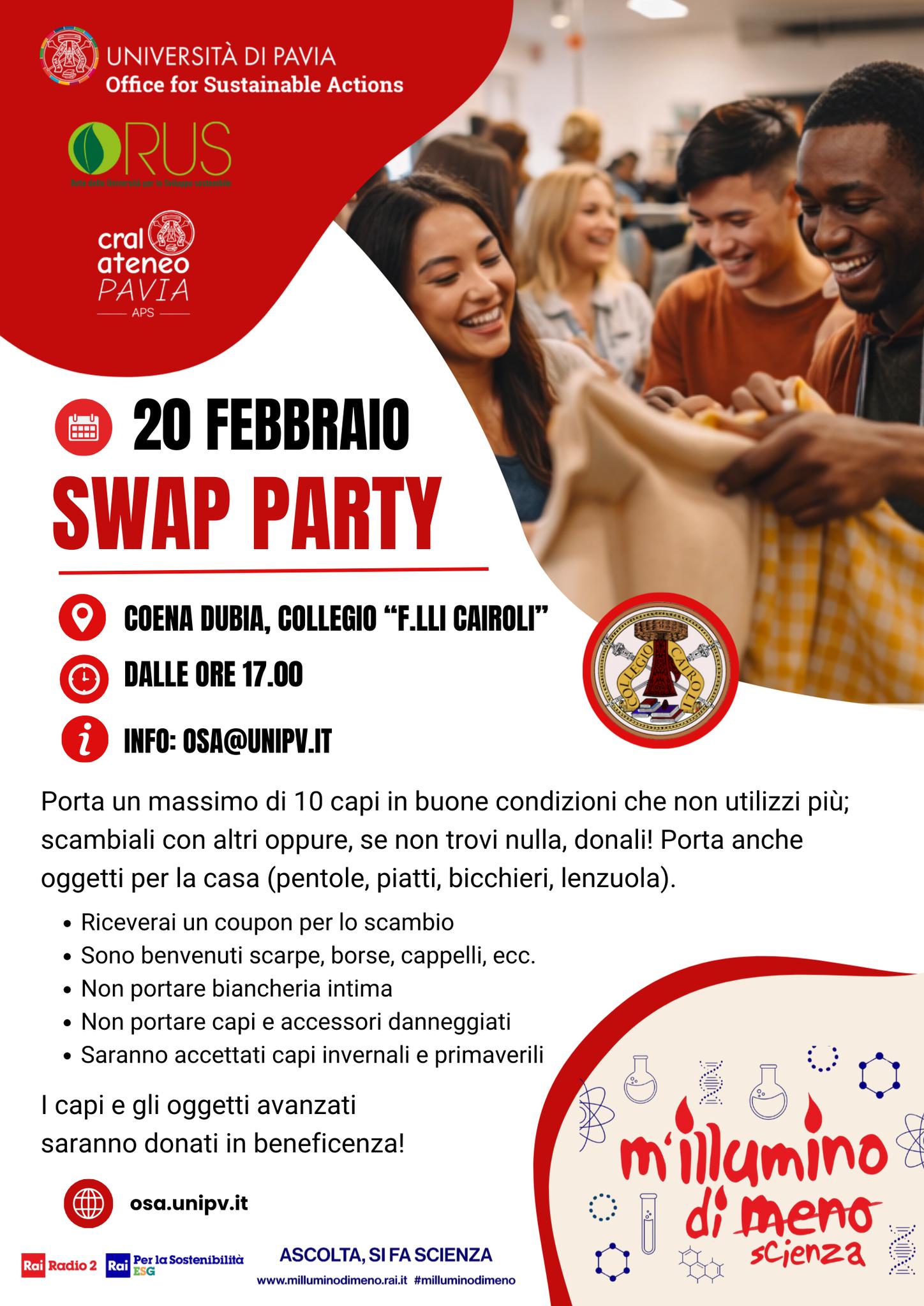Giovedì 20 febbraio, l’Università degli Studi di Pavia invita studenti e cittadinanza allo Swap Party UNIPV, un pomeriggio dedicato alla sostenibilità, alla condivisione e allo spirito di comunità, organizzato in occasione di M’illumino di Meno.