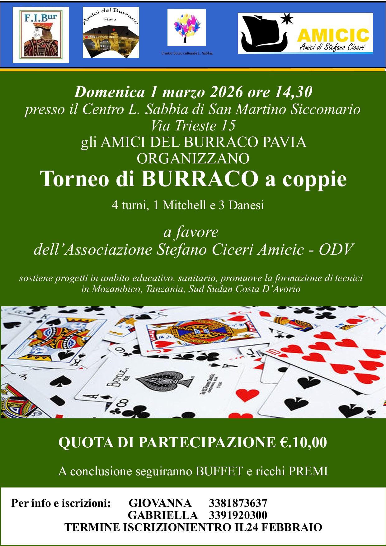 L’iniziativa è organizzata dagli Amici del Burraco Pavia e si svolge a favore dell’Associazione Stefano Ciceri Amicic – ODV, realtà impegnata nel sostegno a progetti educativi e sanitari e nella formazione di tecnici in Mozambico, Tanzania, Sud Sudan e Costa d’Avorio.