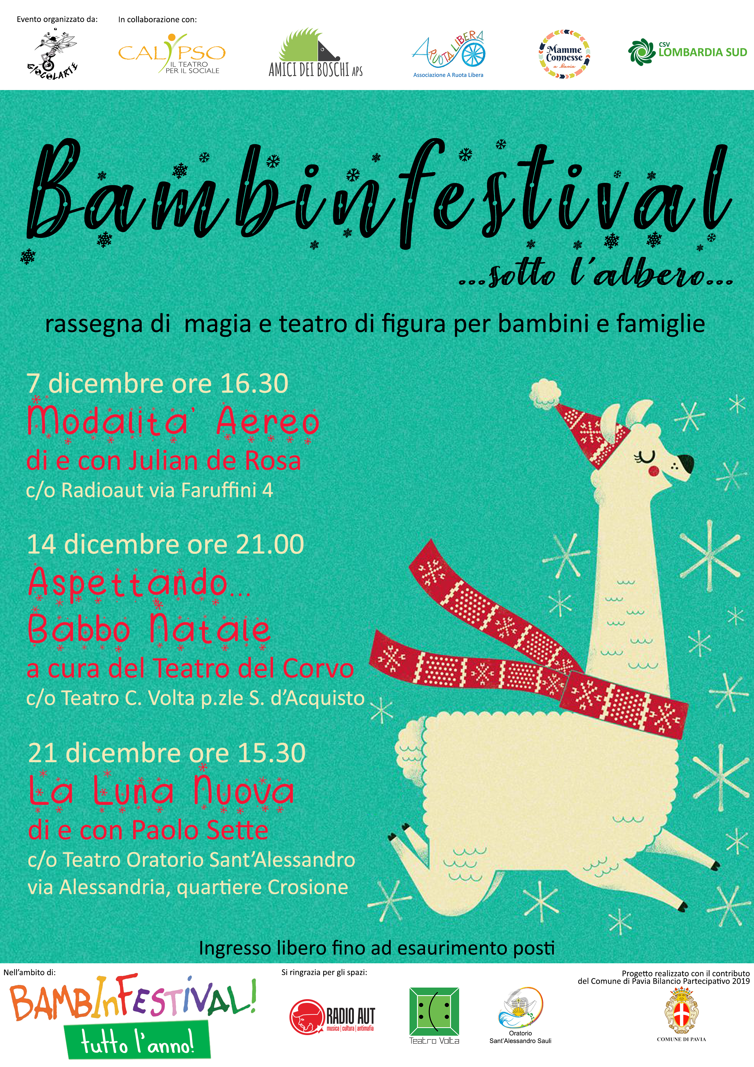 Bambinfestival sotto l’albero è organizzato da Giocolarte in collaborazione con Calypso, Amici dei Boschi, CSV Lombardia Sud, A ruota libera, Mamme connesse e con il contributo del Comune di Pavia nell’ambito del Bilancio Partecipativo 2019. Spazi messi a disposizione da Radioaut, Teatro Volta e Oratorio Sant’Alessandro Sauli.
