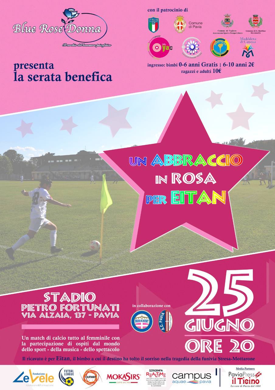 Venerdì 25 giugno 2021 allo Stadio Fortunati, l’associazione Blue Rose Donna e il Pavia Academy SSD Femminile organizzano una partita per il piccolo Eitan, sopravvissuto alla strage di Mottarone.