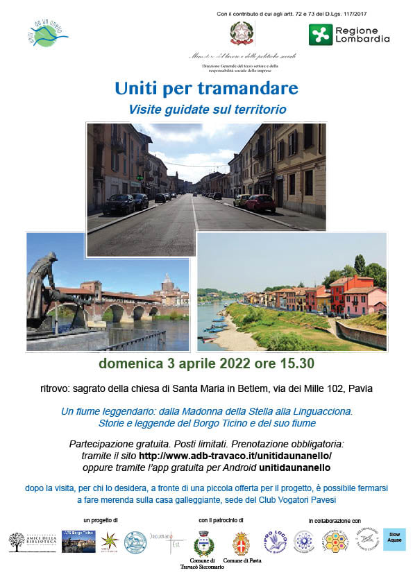 Domenica 3 aprile 2022, alle ore 15:30, si terrà una visita guidata in Borgo Ticino organizzata da Uniti da un anello per raccontare le storie e le leggende del quartiere di Pavia.