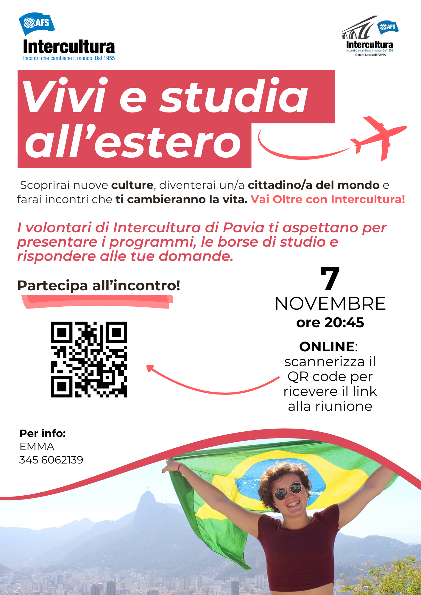 Giovedì 7 novembre alle ore 20.45 si terrà l’incontro online di presentazione dei programmi di studio all’estero AS 2025-2026, del Centro Locale di Pavia di Intercultura.