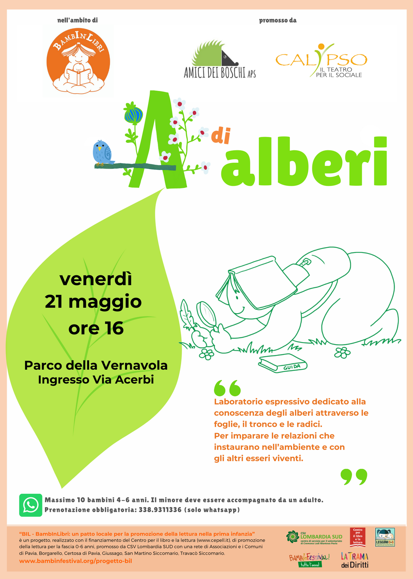 Venerdì 21 maggio alle ore 16 con il laboratorio A di Alberi, durante il quale una naturalista e un narratore dell’Associazione Amici dei Boschi e di Calypso inviteranno a scoprire come vivono gli alberi e come sviluppano relazioni, nella verde cornice del parco della Vernavola, con ingresso da via Acerbi. Ci sono ancora pochi posti disponibili per bambini fra i 4 e i 6 anni, accompagnati da un adulto. manifesto (846 download )