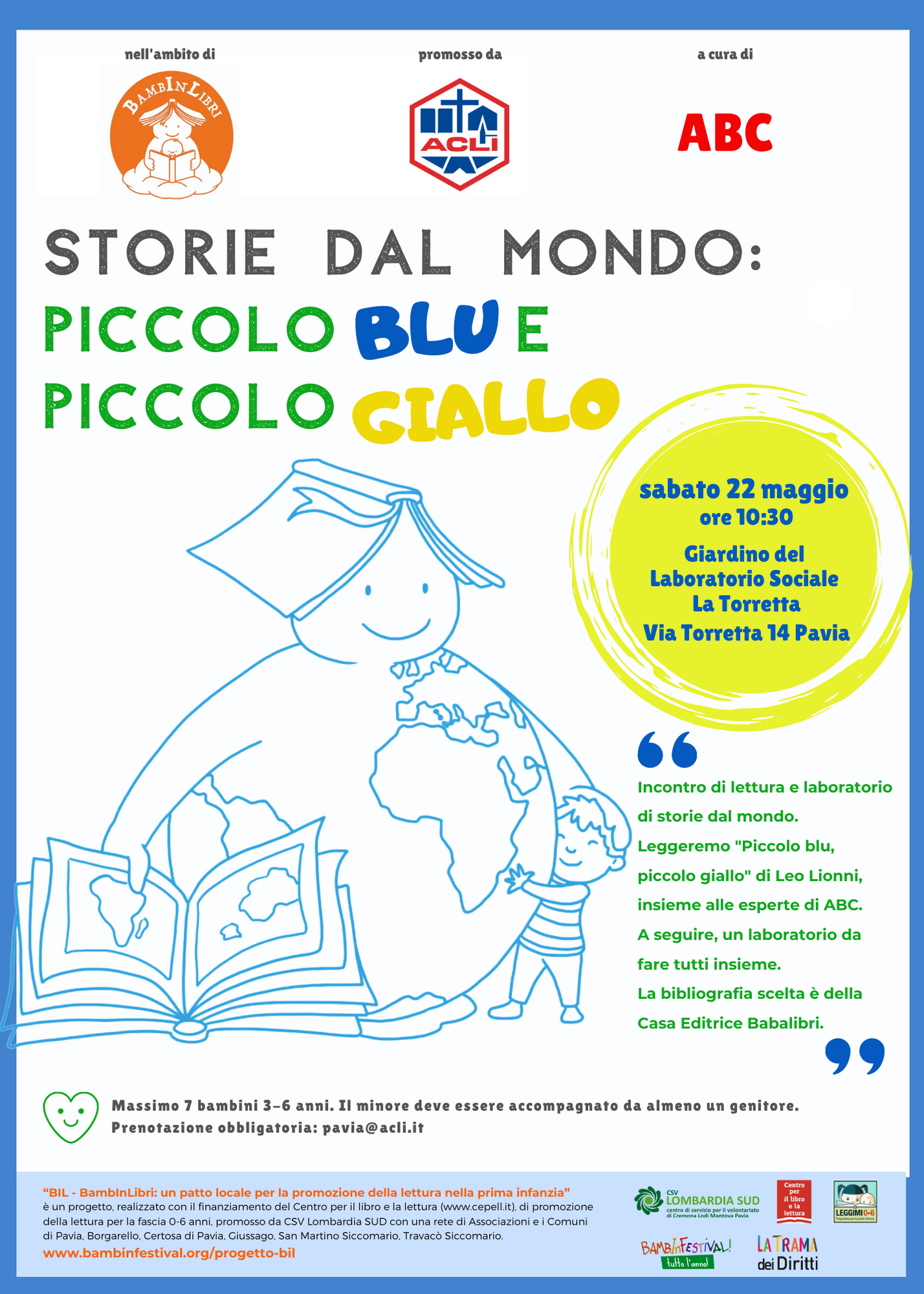 Sabato 22 maggio alle 10:30, nel giardino del Laboratorio Sociale La Torretta le animatrici di ABC animeranno Piccolo blu piccolo giallo, cui farà seguito un laboratorio creativo. L’attività è rivolta a 7 bambini dai 3 ai 6 anni, accompagnati da un adulto. Manifesto (837 download )