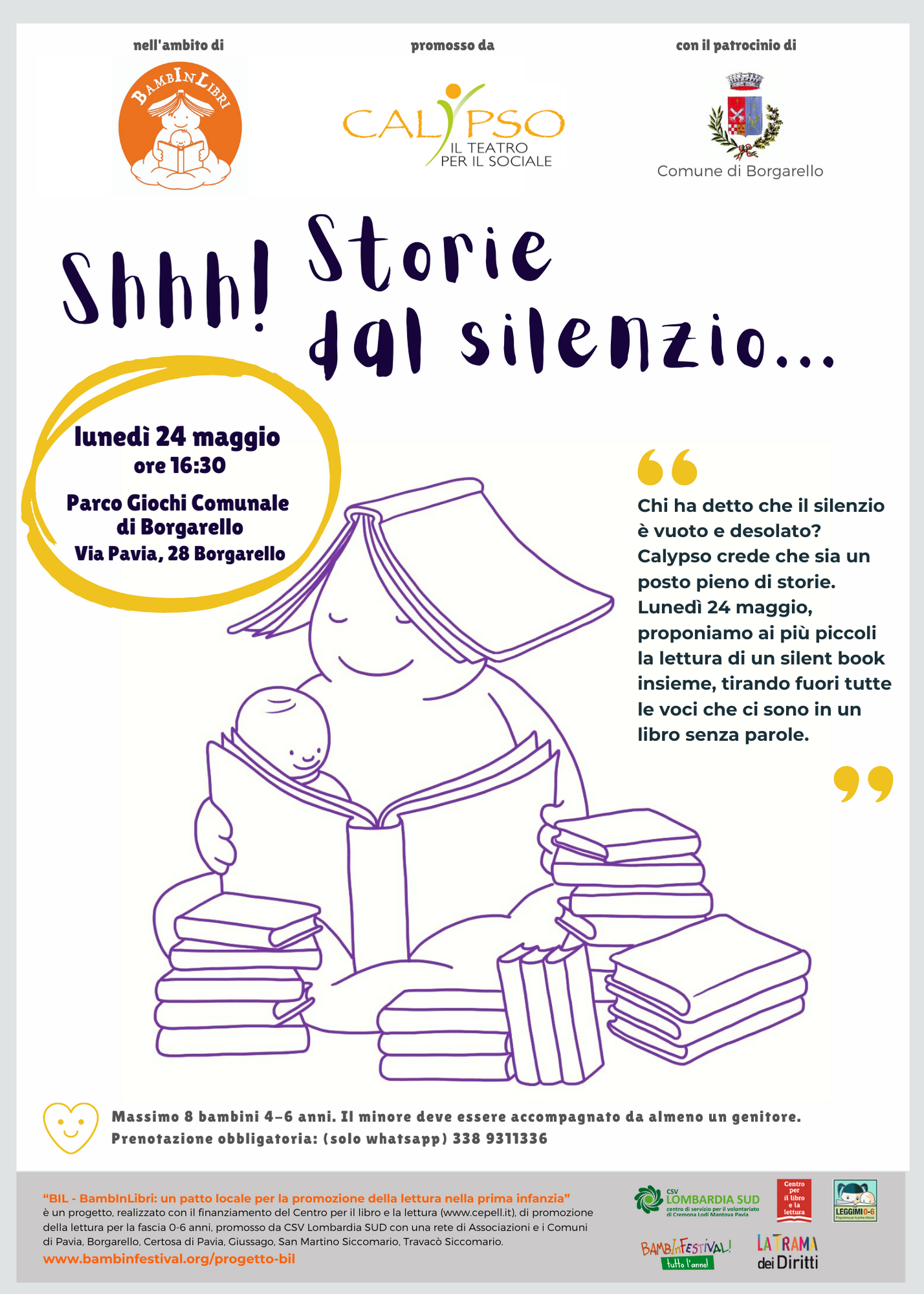 Infine, lunedì 24 maggio alle 16:30, al parco comunale di Borgarello, via Pavia 28, Calypso proporrà una Lettura dal silenzio, in cui verrà proposto a 8 bambini dai 4 ai 6 anni la lettura di un silent book insieme. Seguirà un’animazione. Manifesto (760 download )