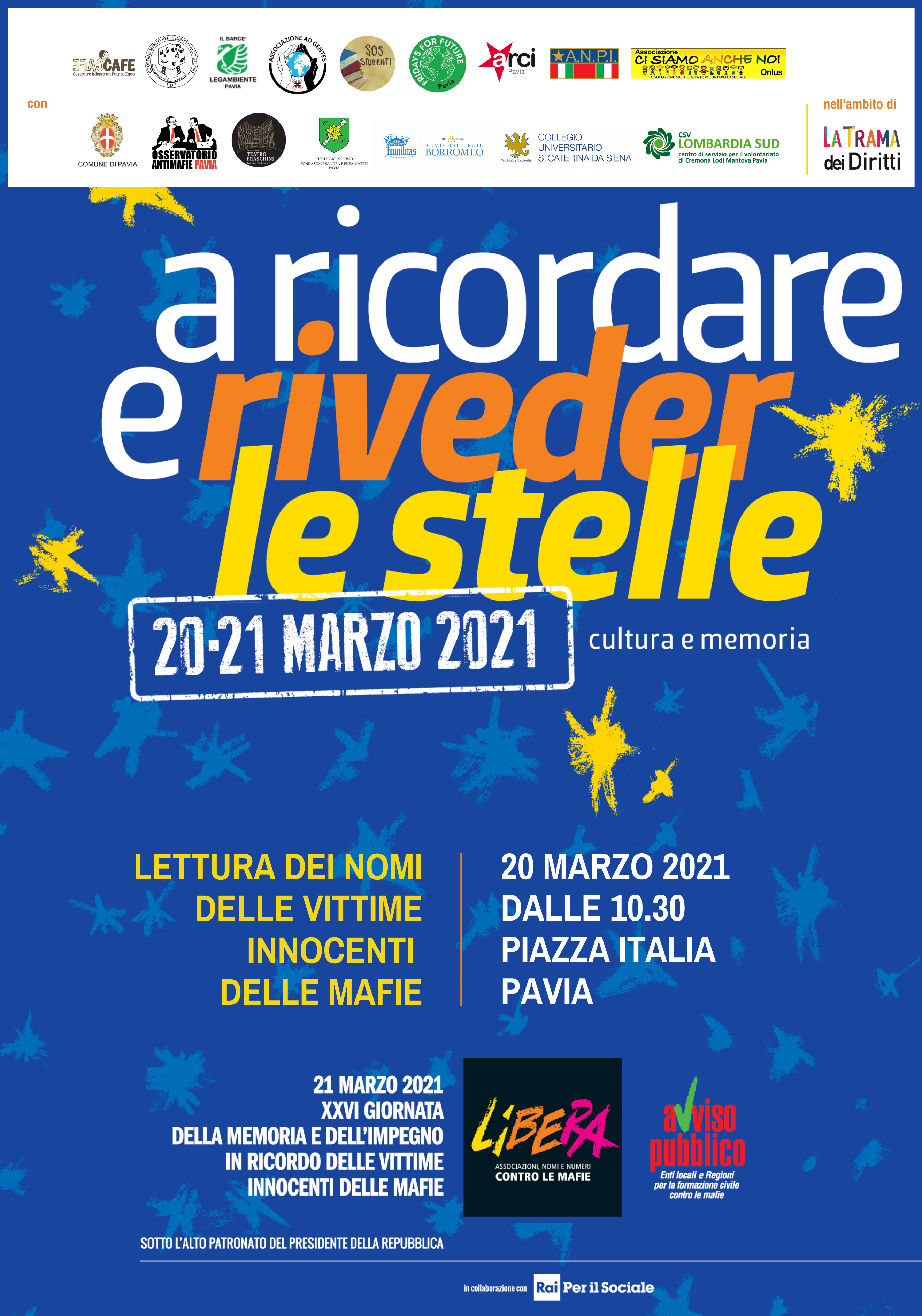 A Pavia la manifestazione, con la lettura dei nomi delle vittime, avrà luogo sabato 20 marzo a partire dalle ore 10:30 in Piazza Italia, tra il Teatro Fraschini e il Palazzo Centrale dell’Università. Il manifesto (310 download ) della manifestazione.