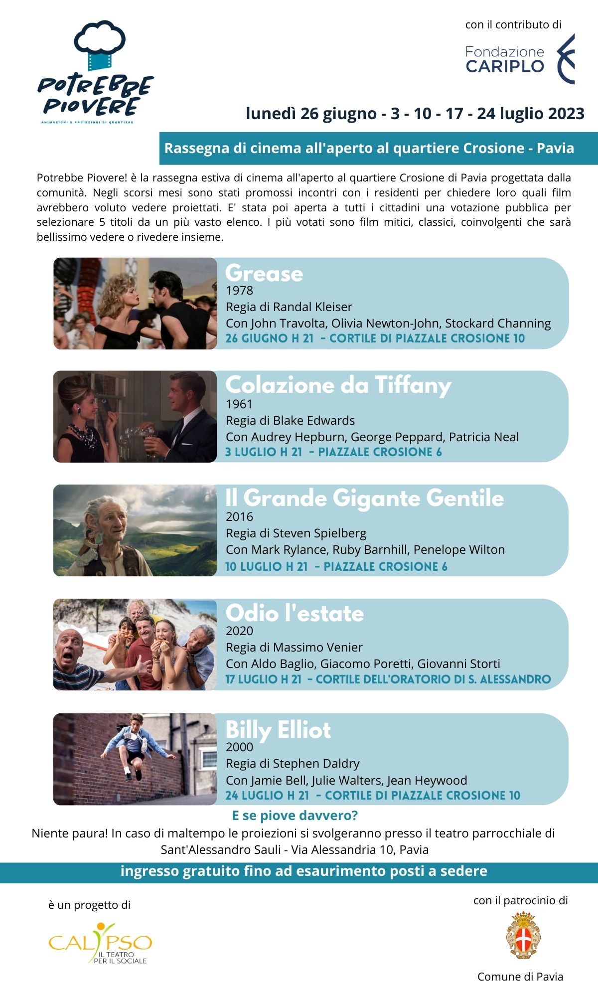 Potrebbe piovere, la rassegna di cinema estiva e all’aperto del quartiere Crosione di Pavia, progettata e ideata per la comunità dalla comunità. Dopo diversi incontri in cui si chiedeva ai cittadini di scegliere i film che avrebbero voluto vedere proiettati, e dopo il successivo sondaggio ad essi, sono stati scelti 5 film da vedere insieme per farci compagnia in alcune serate di questa calda estate.