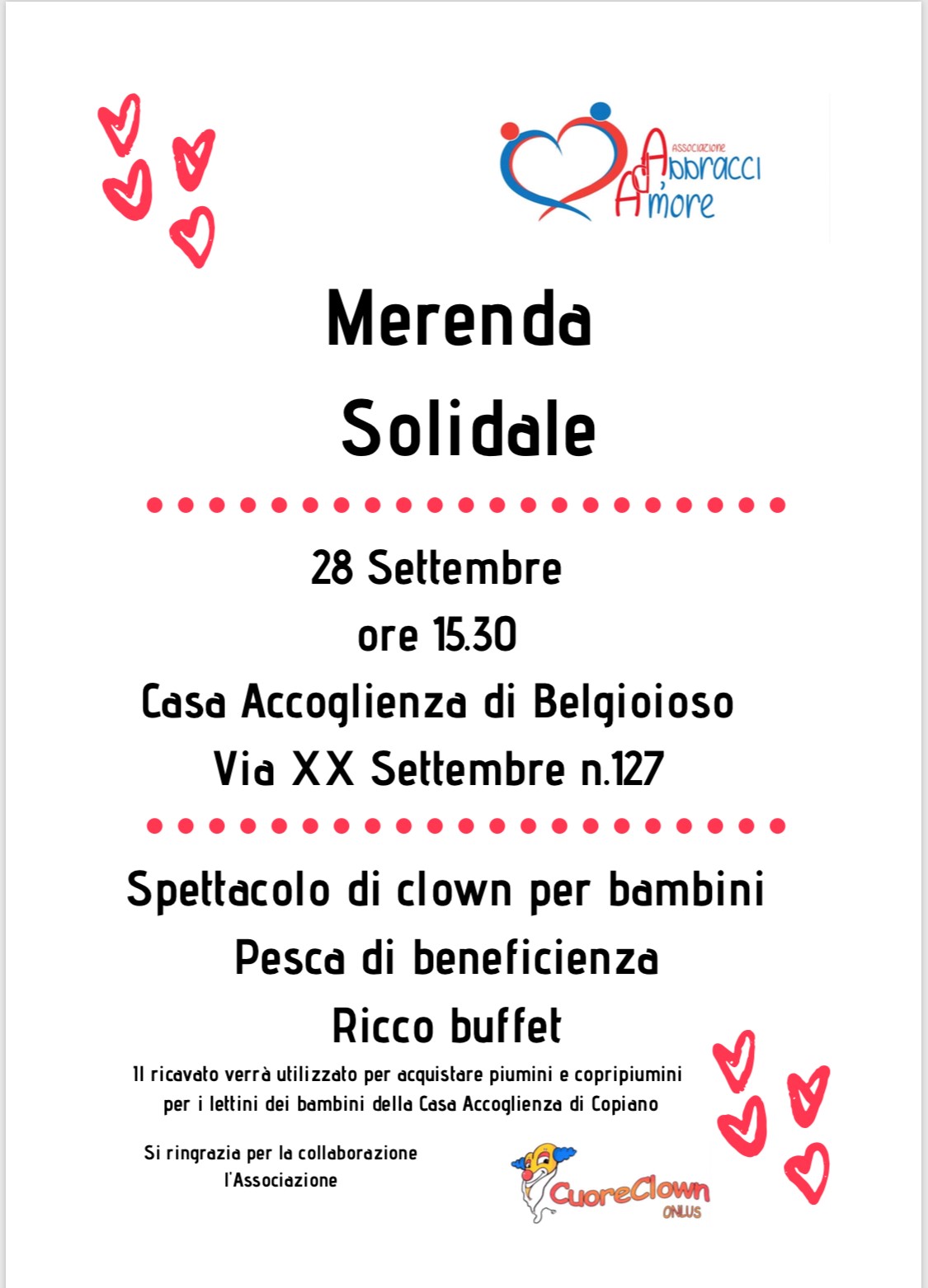 L’Associazione Abbracci d’Amore in collaborazione con L’Associazione Cuore Clown ha organizzato una Merenda Solidale per i bambini. Sabato 28 settembre alle ore 15.30 la Casa Accoglienza alla Vita di Belgioioso apre le sue porte per ospitare tutti coloro che hanno voglia di trascorrere un pomeriggio in allegria.