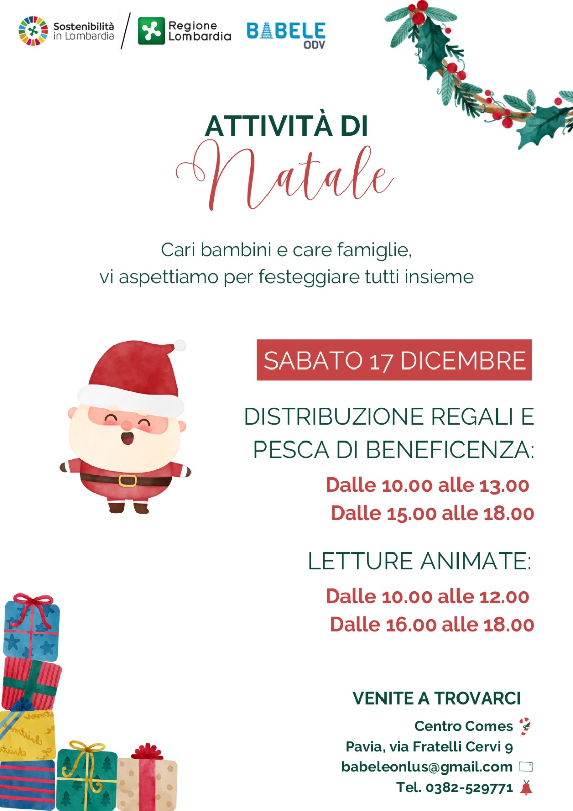 Babele ODV organizza sabato 17 dicembre al Centro Comes di Pavia, dalle 10.00 alle 13.00 e dalle 15.00 alle 18.00 i volontari aspettao tutti i bambini e le bambine per la distribuzione dei regali di Natale!