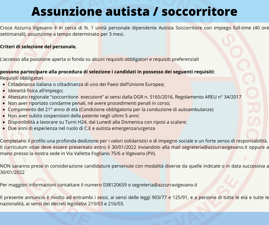 Croce Azzurra Vigevano è in cerca di un Autista Soccorritore con impiego full-time (40 ore settimanali), assunzione a tempo determinato per 3 mesi.