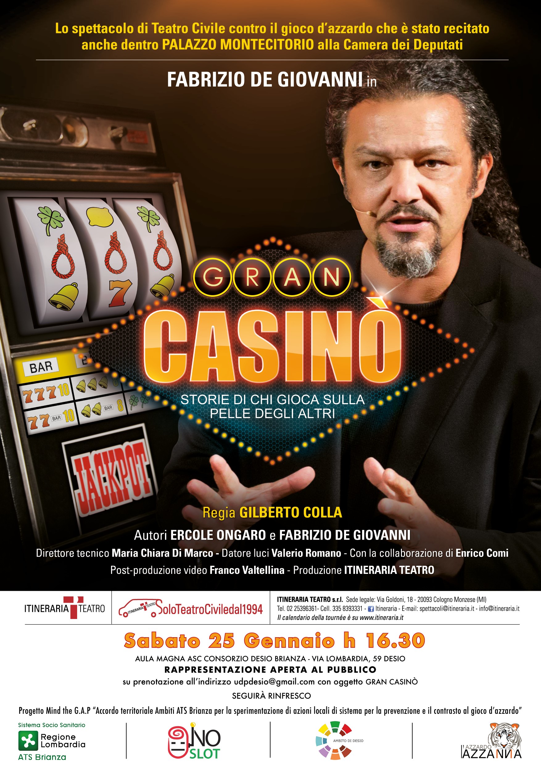 L’Ufficio di Piano di Desio insieme a CSV Monza Lecco Sondrio e ai partner del progetto MIND THE G.A.P. –“Accordo territoriale Ambiti ATS Brianza per la sperimentazione di azioni locali di sistema per la prevenzione e il contrasto al gioco d’azzardo” vi invita SABATO 25 GENNAIO alle h 16.30 ad una speciale rappresentazione di GRAN CASINO, uno spettacolo contro il gioco d’azzardo, scritto e messo in scena dalla compagnia di Teatro Civile ITINERARIA. Lo spettacolo si terrà nell’Aula Magna di ASC Consorzio Desio Brianza – Via Lombardia 59, Desio. Seguirà rinfresco. Prenotazioni a ufficiodipiano@comune.desio.mb.it