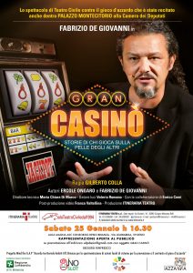 Gran Casinò racconta le storie di chi gioca sulla pelle degli altri e le sofferenze silenziose di quanti si perdono nel tunnel della dipendenza. Un’occasione per comprendere cosa si celi dietro un business miliardario che stritola le sue vittime e le loro famiglie tra ignoranza, false credenze, usura e criminalità. Una serata a teatro per sorridere amaro, riflettere e imparare a stare alla larga dall’azzardo, che non è un gioco né un modo per risolvere piccoli o gravi problemi economici. Senza mai stancarsi di ricordare che i minori vanno sempre tutelati, perché per Legge i giochi d’azzardo, ovvero tutti quelli con vincite in denaro, sono vietati ai minori.