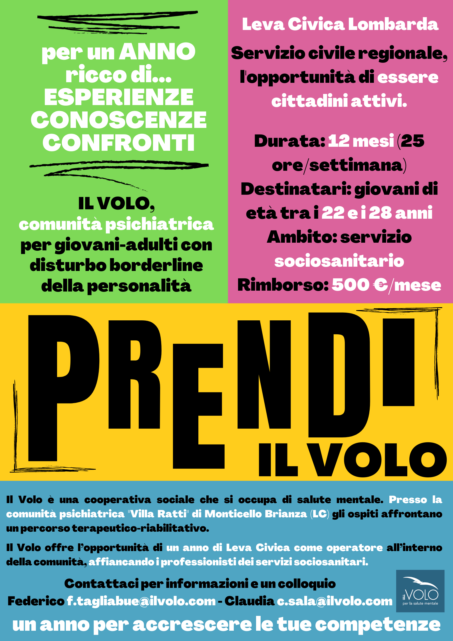 IL VOLO è quindi alla ricerca di due persone che vogliano svolgere il servizio di Leva Civica presso la comunità per la durata di dodici mesi e con impegno settimanale di 25 ore per il quale vi sarà un rimborso mensile di euro 500. La nostra ricerca è finalizzata a persone con età compresa tra i 22 e i 28 anni (per la tipologia di utenti della comunità abbiamo dato come età minima 22 anni) che abbiano terminato o stiano studiando in ambito educativo-riabilitativo, psicologico o infermieristico e che abbiano voglia di impegnarsi per il proprio futuro.