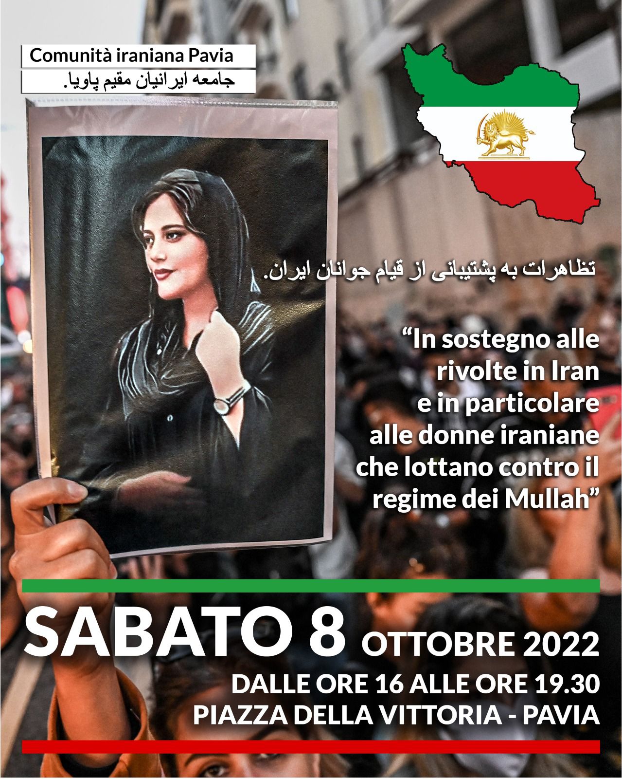 Sabato 8 ottobre manifestazione organizzata dalla Comunità iraniana di Pavia in sostegno alle rivolte in Iran e in particolare alle donne iraniane che lottano contro il regime dei Mullah, come dichiara la Comunità iraniana di Pavia.