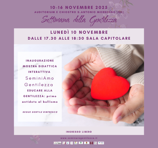 Durante tutta la settimana, presso il Chiostro S. Antonio, si svolgeranno iniziative culturali, laboratori ed esperienze espressive, promosse in collaborazione con associazioni, biblioteche, educatori, professionisti e volontari del territorio. Le attività saranno aperte alle scuole e alla cittadinanza e sarà possibile visitare una mostra didattica interattiva dedicata alla gentilezza.